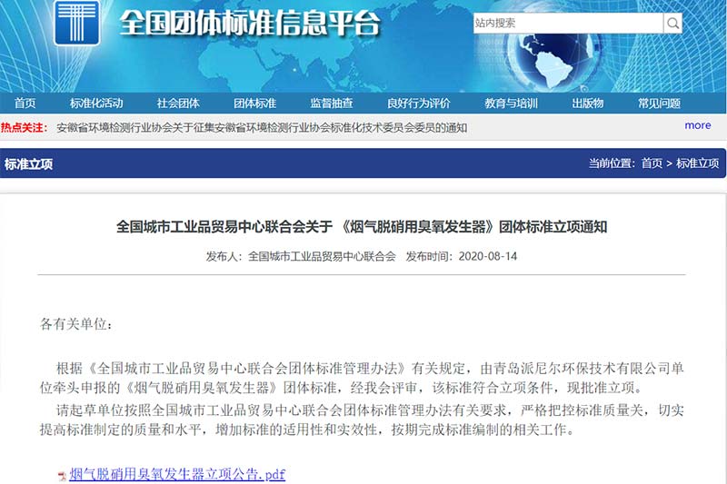 • 全國城市工業(yè)品貿(mào)易中心聯(lián)合會關(guān)于《煙氣脫硝用臭氧發(fā)生器》團體標(biāo)準(zhǔn)立項通知